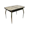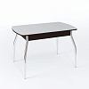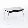 Столешница имеет размер 1 м 10 см, синхронно-раздвижной механизм “бабочка” позволяет увеличить ее еще на 30 см и увеличить количество посадочных мест. Материалы изготовления - ЛДСП, МДФ и закаленное стекло. В ассортименте варианты с цветным стеклом, с узором, с кожзамом, с фотопечатью и даже с искусственным камнем. Ножки могут быть гнутыми или прямыми, из хромированной стали или массива березы в одном из трех цветов - выбор комбинаций просто огромный.